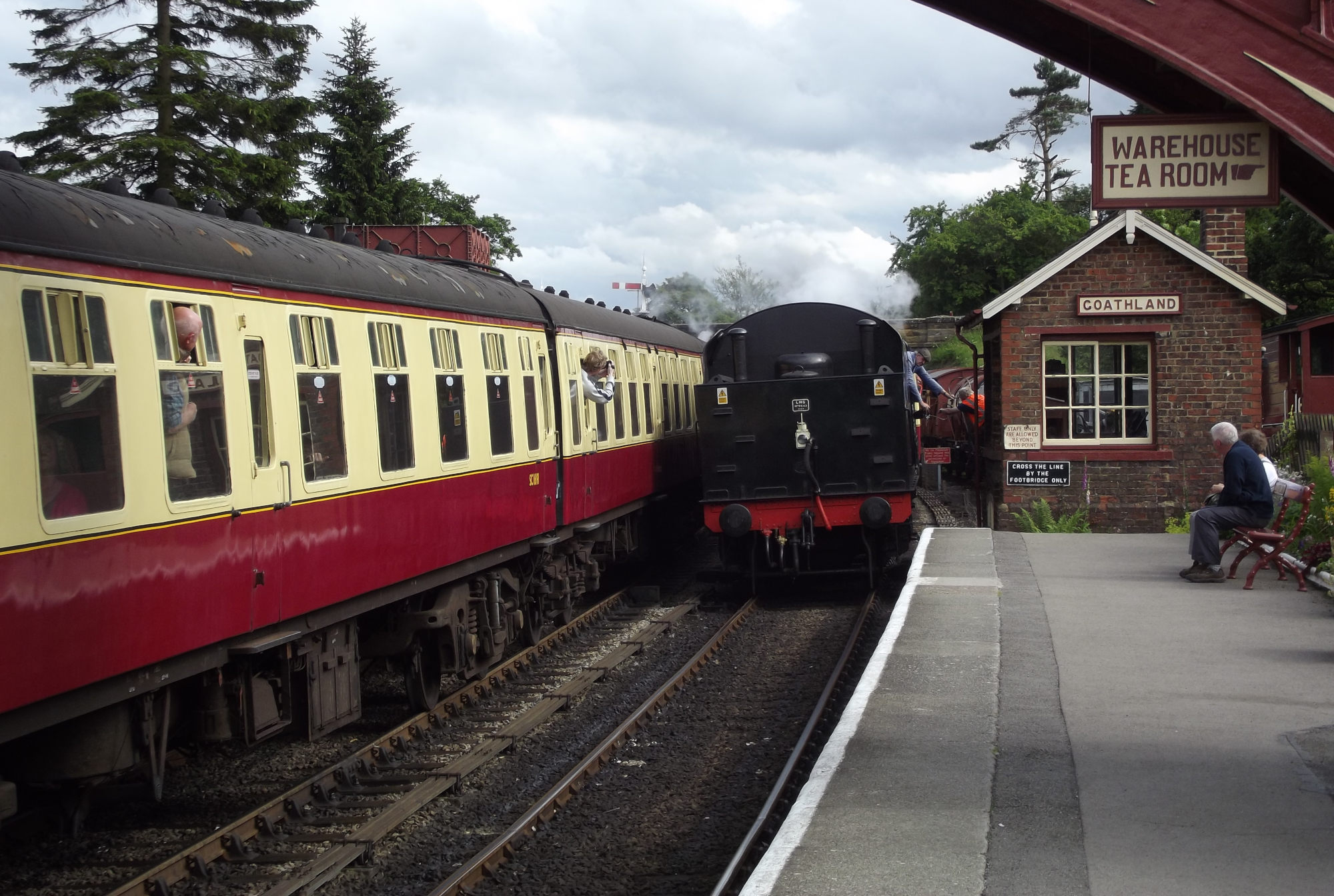 Title: Steam train at “Aidensfield” in Yorkshire, United Kingdom.